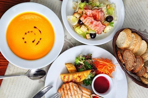 Салат "ФаСоль"120гр /кур.грудка копченая,фасоль консерв., маринованные огурцы, лук красный,зелень, масло растительное,специи/ Паста "ТомЯм" 200гр /спагетти, куриное филе в сливках, шампиньоны, паста острая Том ям, сыр/ Лепешка 2 куска Предложение работает по будням 12:00-16:00