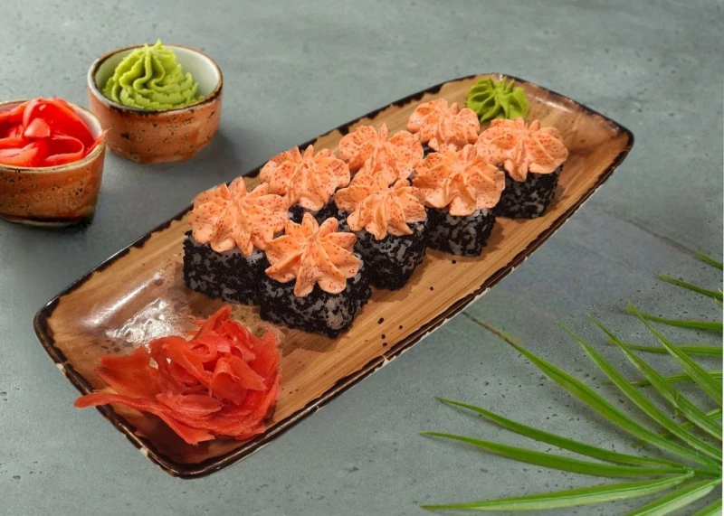 Филе лосося, сыр, рис, масаго, соус лава, имбирь, васаби, соевый соус.