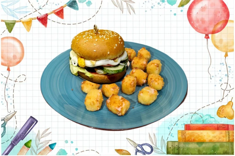Комбо с бургером Крутикс с фри и томатным соусом и гарниром из сырных кубиков Майнкрафт.