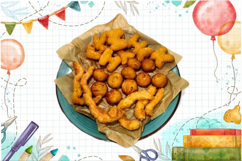 Хрустящие картофельные буквы фри, стрипсы куриные, картофельные байтсы.