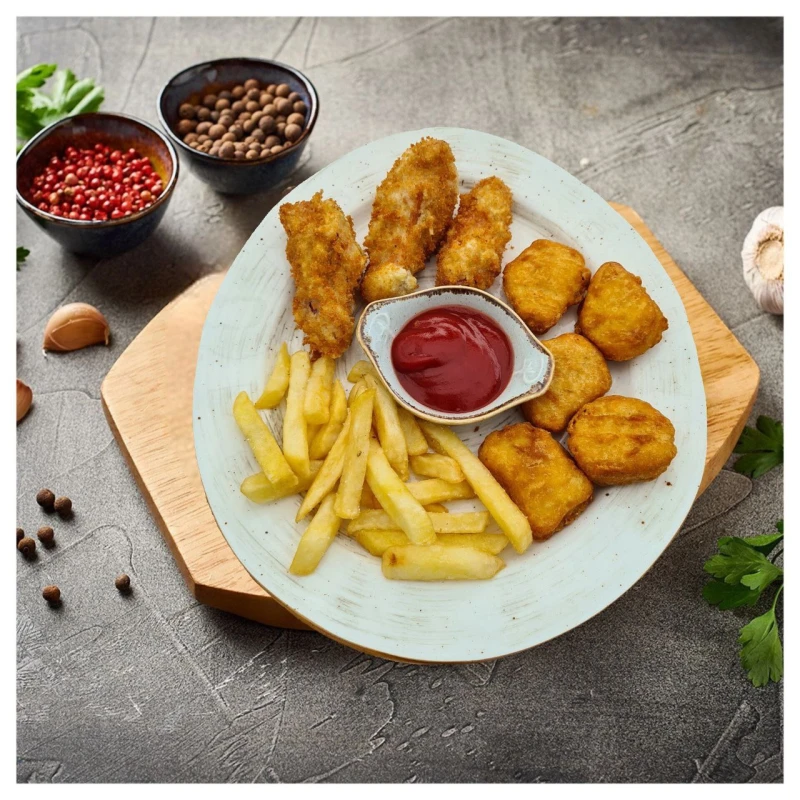 300г | крылышки 3 шт, наггетсы 5 шт, фри 50гр, кетчуп 30г Для тех, кто любит побольше!