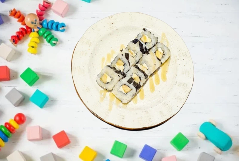 Рис, банан, сыр творожный, топпинг банан, сахарная пудра.