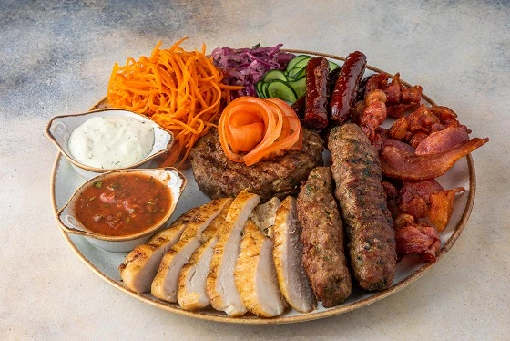 - Куриное филе на гриле, люля кебаб, чипсы бекон, котлета, охотничьи колбаски, овощи, морковь по-корейски