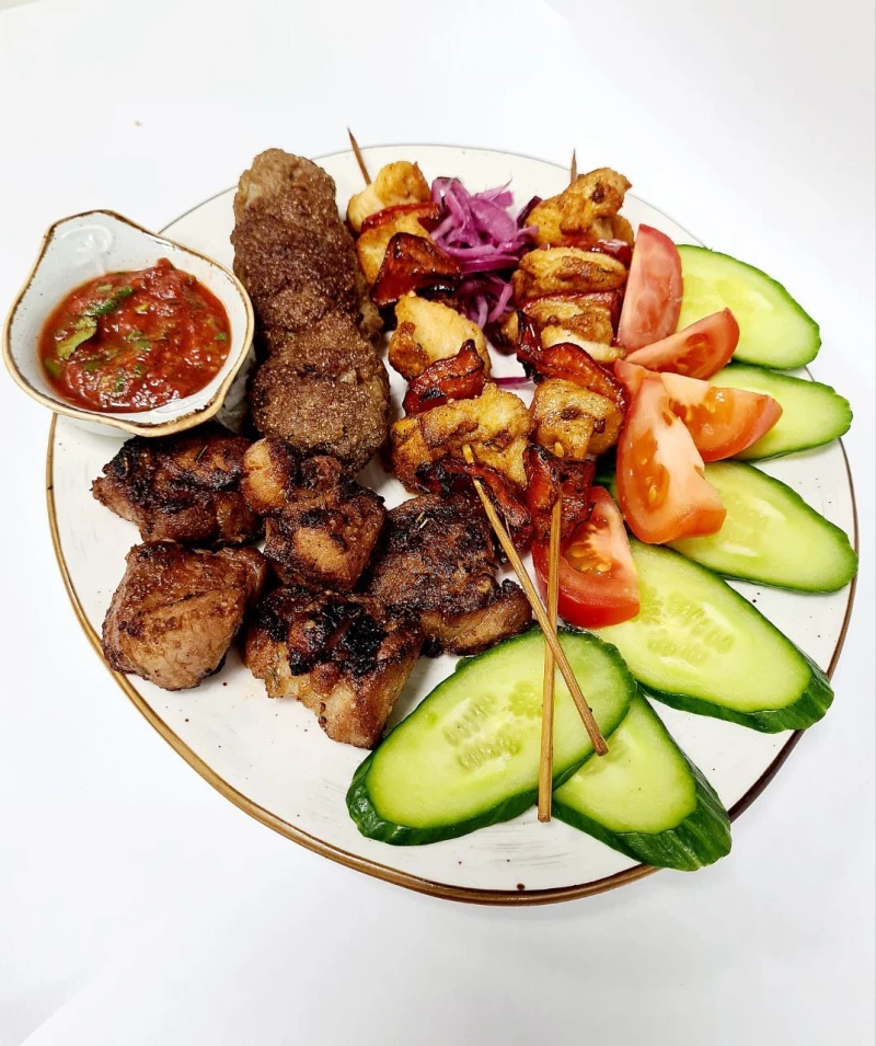 Свинина на шпажке, люля кебаб на шпажке, куриное филе с болгарским перцем на шпажке, томаты, огурцы, лук маринованный, соус восточный
