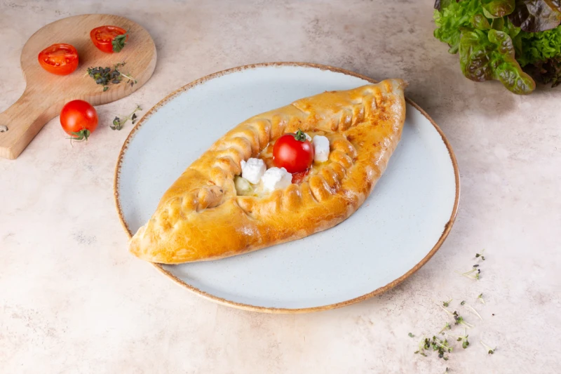 Дрожжевое тесто, сыры фетаки, сулугуни, обжаренные в сливочном масле болгарский перец,кабачок, томаты