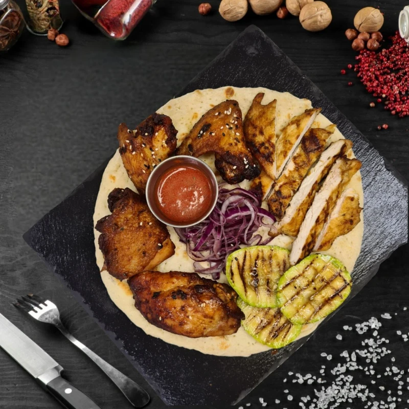 610г| куриное филе, куриное крыло, куриное бедро, кабачки, лук красный маринованный, лепешка