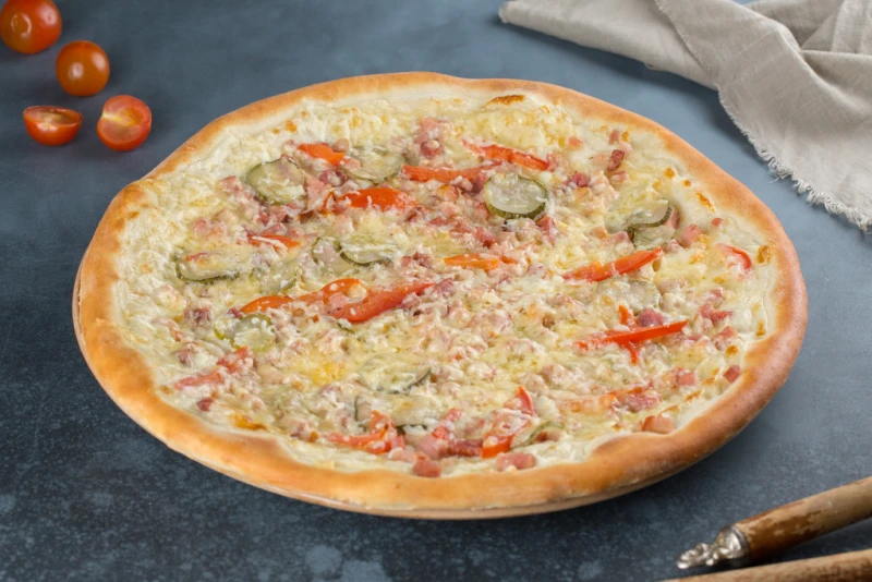 - салями, бекон, томат, шампиньоны, огурцы маринованные, сыр, томатный соус