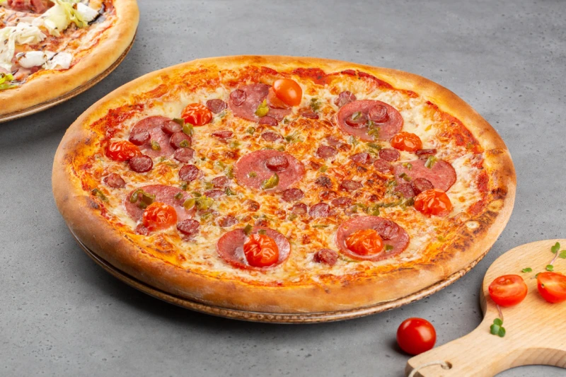Салями, охотничьи колбаски, сыр, перец халапеньо, томаты Черри, перец острый молотый, соус томатный.