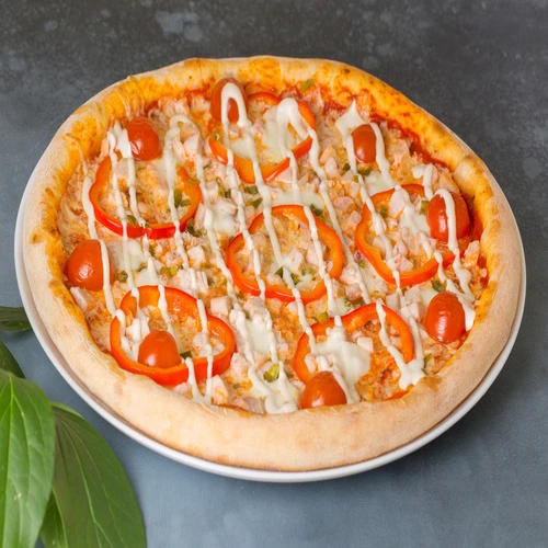 Томатный соус, сыр, курица копченая, шампиньоны, перец болгарский, томаты черри, моцарелла, перец халапеньо.