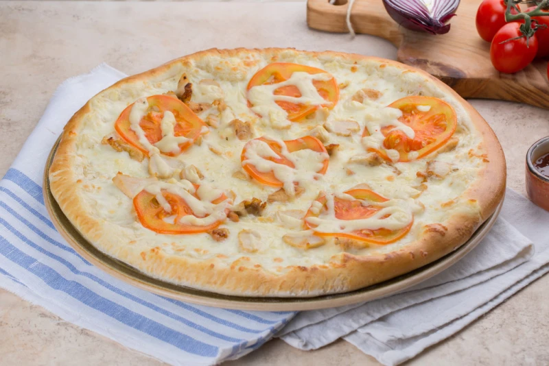 жареное куриное филе, сыр, томат, соусы бешамель, цезарь