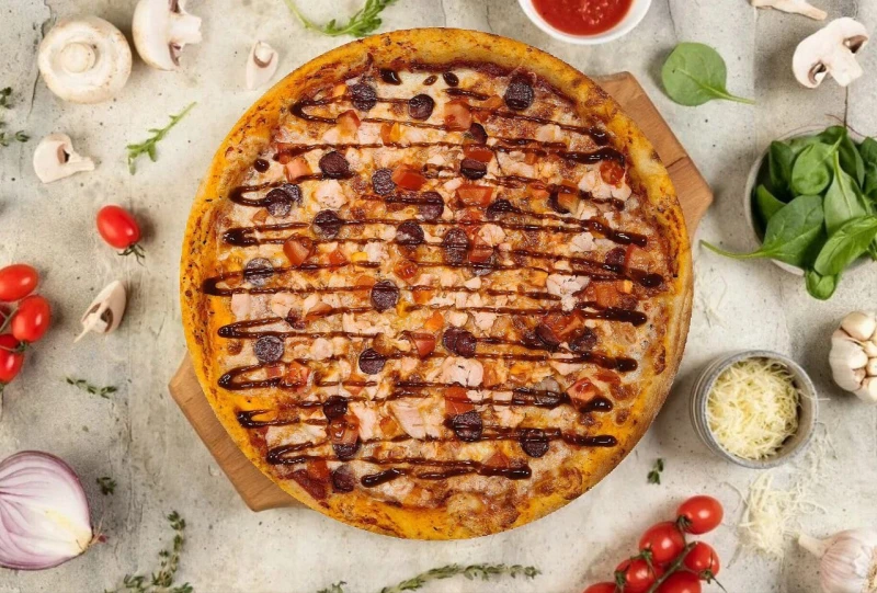 Соус томатный, сыр, курица копченая, колбаски охотничьи, томаты, соус барбекю.