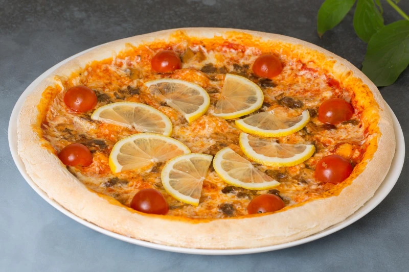 Соус томатный, сыр, лосось в соусе терияки, лимон, томаты черри
