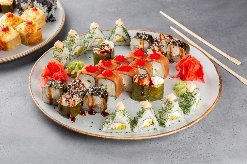 26 шт / Суши - гункан с лососем, суши- гункан с крабом, ролл салют, ролл нирвана, ролл фокус. *Не входит имбирь, васаби и соевый соус