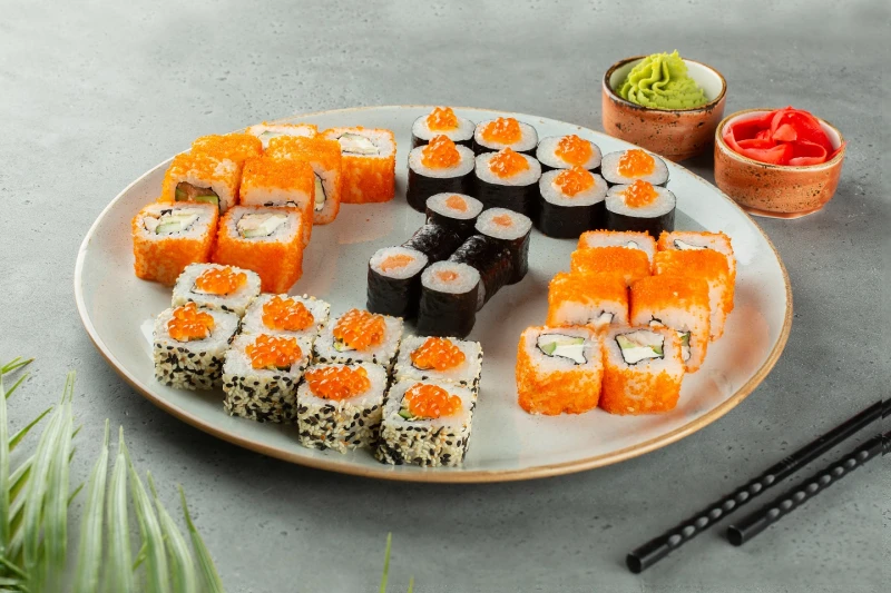 40 шт/ Калифорния с крабом, калифорния с курицей, ролл с лососем, эби ролл, икура.*Не входит имбирь, васаби и соевый соус