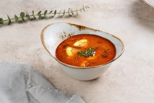 - Филе дикого лосося, тигровые креветки, морской коктейль, лук, сливки, шампиньоны, кокосовое молоко, паста том ям, специи.