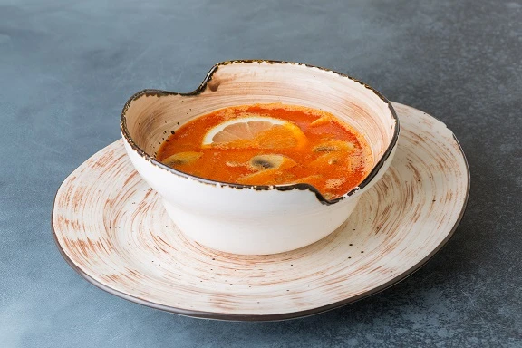 Филе дикого лосося, тигровые креветки, морской коктейль, лук, сливки, шампиньоны, кокосовое молоко, паста том ям, специи.
