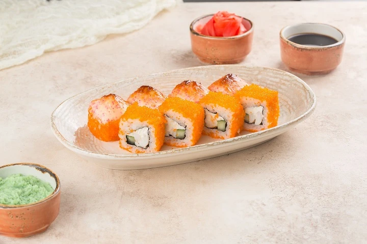- Тигровые креветки, огурец, сливочный соус, сыр сливочный, масаго