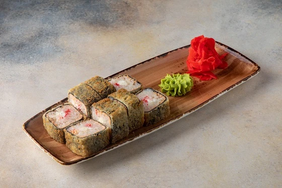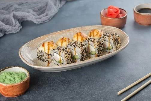 - Нори, жаренное куриное филе, сыр, соус унаги, кунжут.