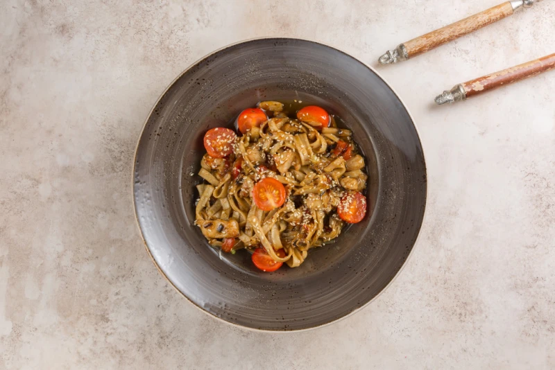 - Говядина, кабачок, баклажан, паприка, морковь, лук репчатый, соус шрирачи, унаги, лапша, кунжут, терияки