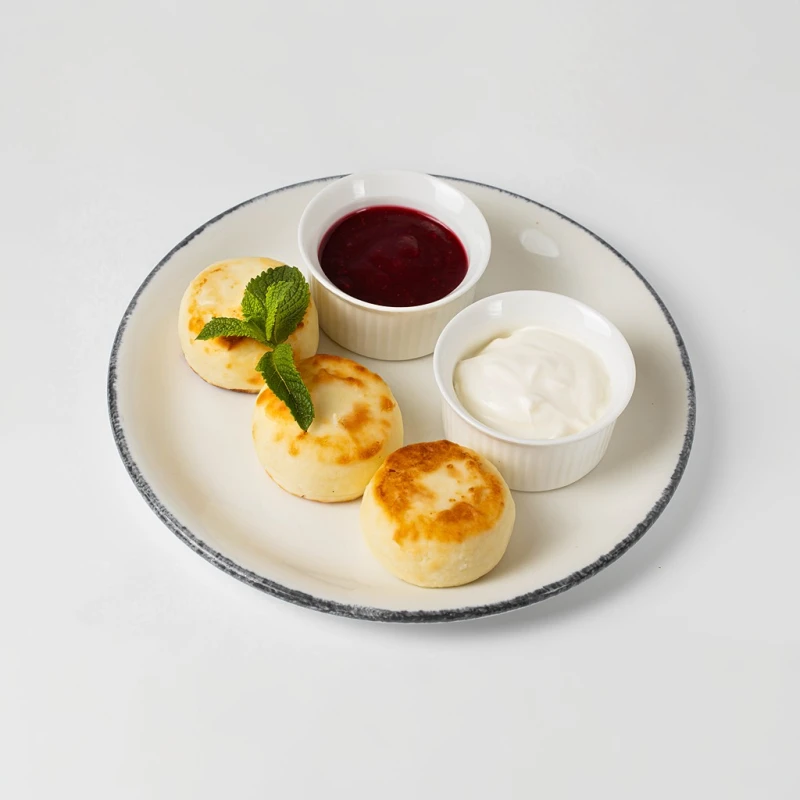 - Сырники творожные с клубничным топпингом и сахарной пудрой.